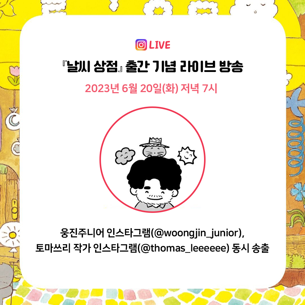 『날씨 상점』에 대한 모든 것들을 토마쓰리 작가님께 직접 들을 수 있는 라이브 방송에 여러분을 초대합니다.