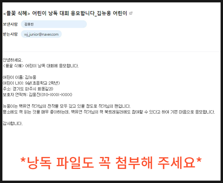 - 응모하는 어린이의 이름, 나이, 주소, 간단한 참여 이유 기재