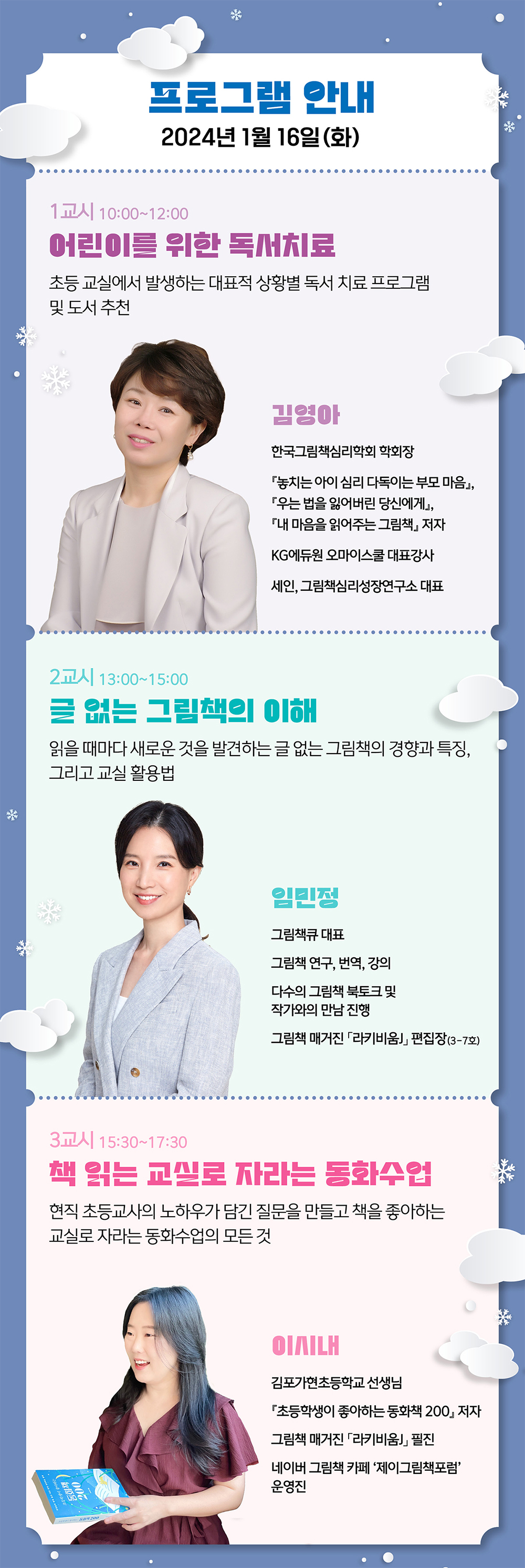 - 강연자: 김영아 (한국그림책심리학학회 학회장, 『놓치는 아이 심리 다독이는 부모 마음』 저자