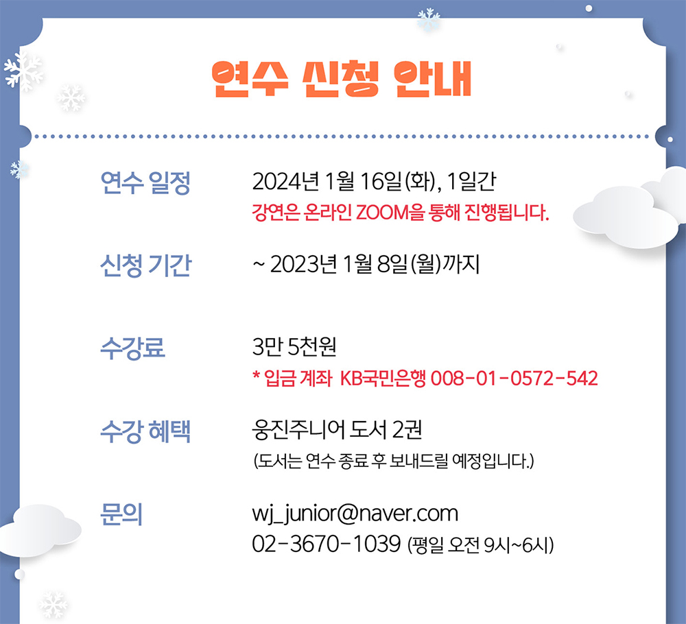 - 1월 9일(화) 이후 취소 건에 대해서는 환불이 불가하며, 대신 웅진주니어 도서 2권을 신청 시 입력하신 주소로 발송해 드립니다.