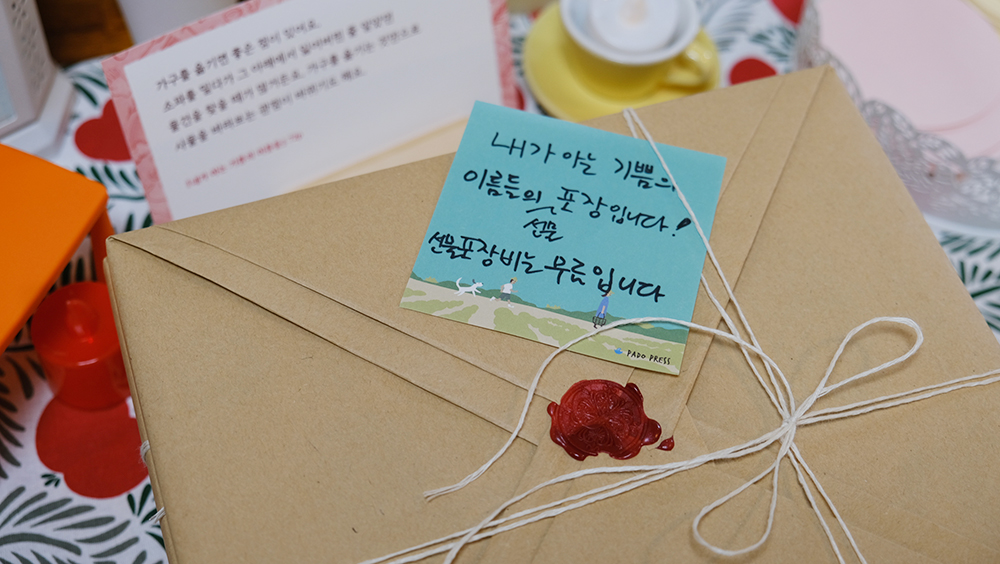 코뿔소책방 전시 테이블 위에 있는 종이에