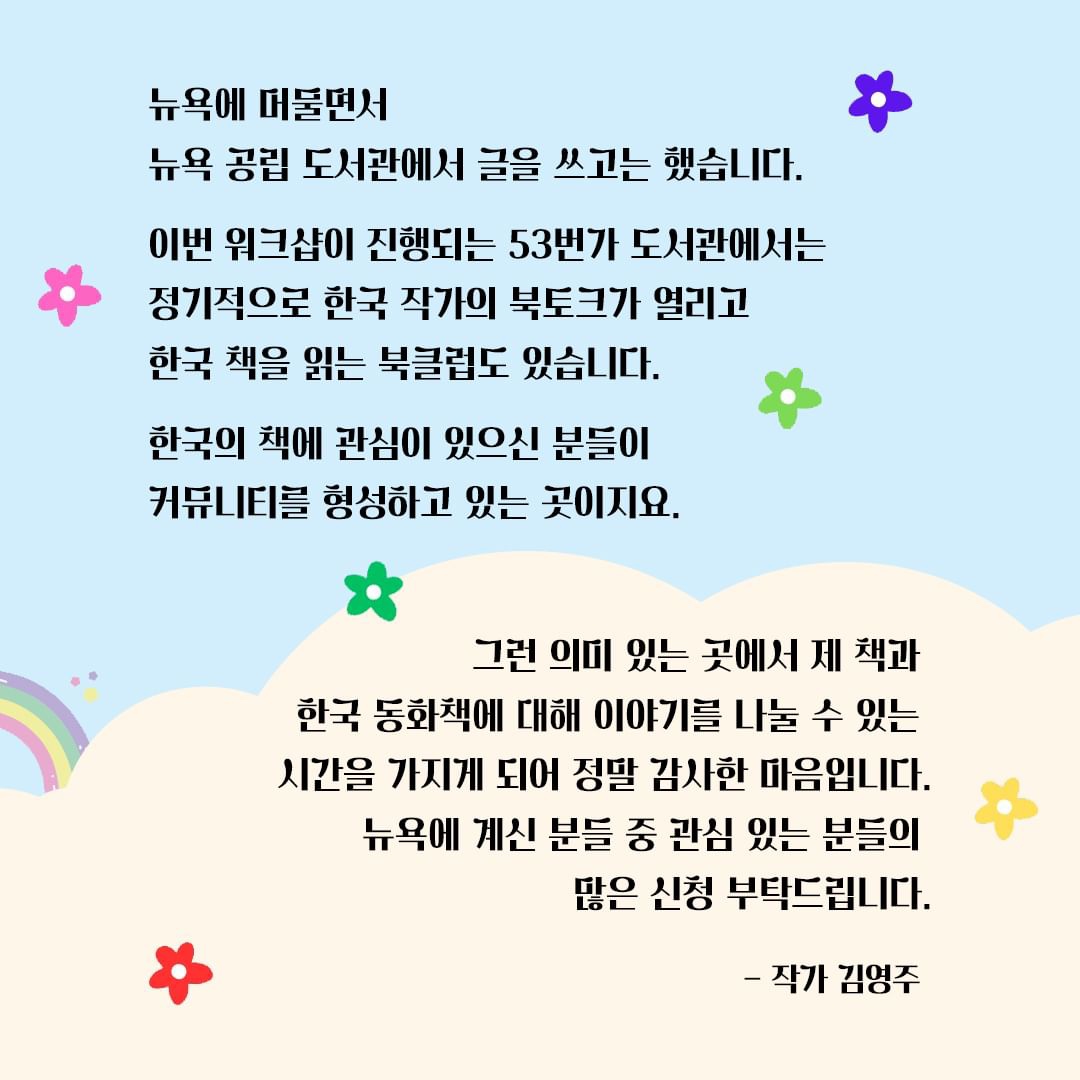 한국의 책과 동화에 관심 있는 뉴욕의 독자님들을 위한 동화 워크샵.