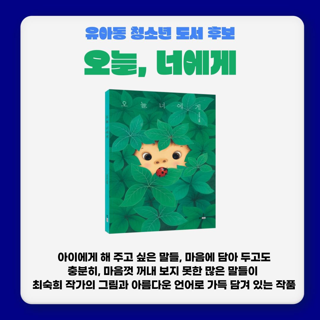 아이와 함께해 온 시간들, 그 순간의 이야기들을 소환해 본다면? 최숙희 작가는 그 소중한 시간들을 더 아름답게 추억할 수 있길 바라는 마음에서 『오늘, 너에게』를 지었습니다. 아이에게 해 주고 싶은 말들, 마음에 담아 두고도 충분히, 마음껏 꺼내 보지 못한 많은 말들이 『오늘, 너에게』 안에 아름다운 언어로 가득 담겨 있습니다. 『오늘, 너에게』는 매일매일을 처음처럼 기억하고 사랑하고 응원하는 마음을 고백하는 그림책입니다.