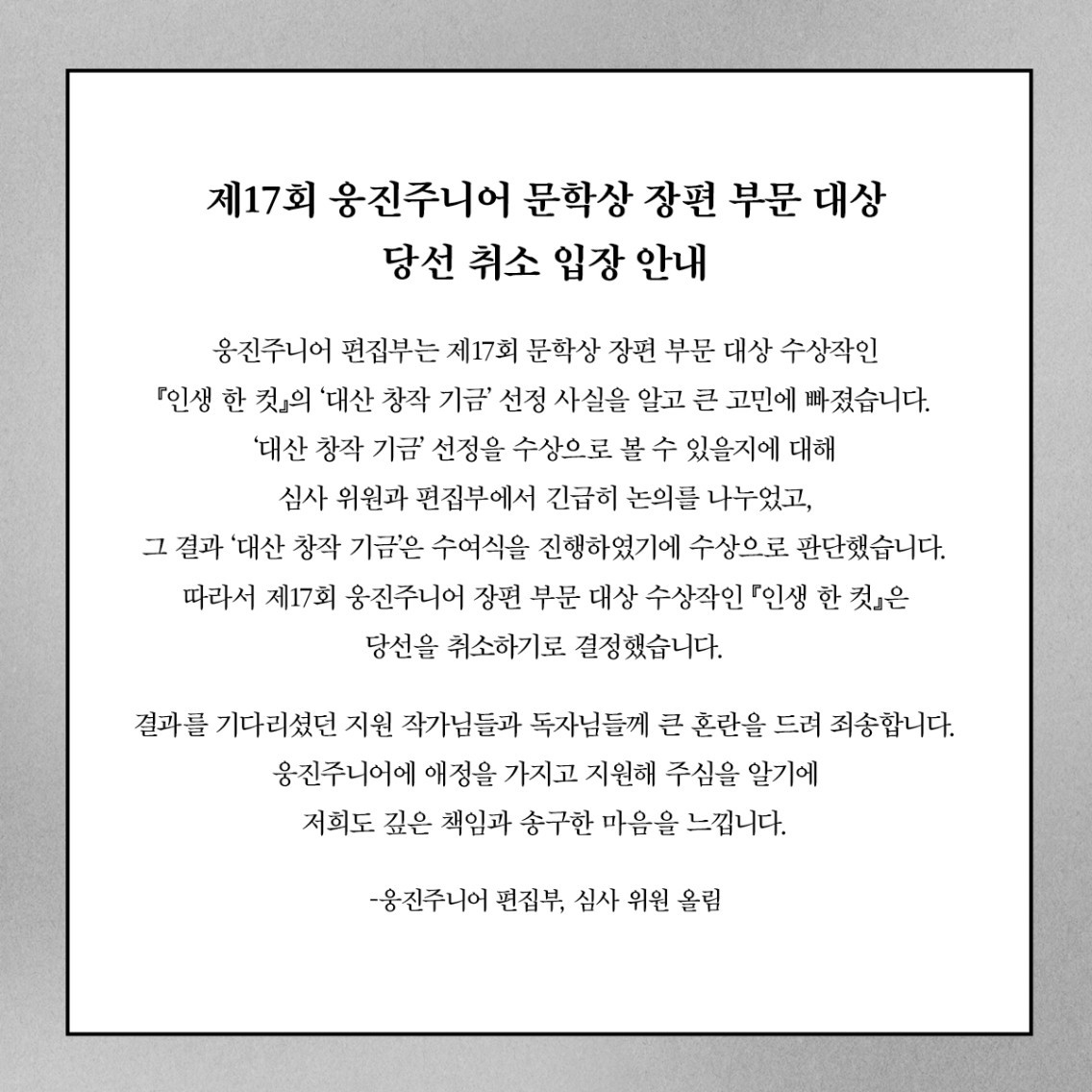 이 결정에 대해 편집부도 깊은 책임을 느끼고, 위와 같은 상황이 다시 반복되지 않도록 명확한 기준을 정리하겠습니다. 해당 작가가 받을 충격과 고통이 크다는 것을 알기에 죄송한 마음을 전하며 어려운 결정을 내렸음을 알려드립니다. 결과를 기다리셨던 지원 작가님들과 독자님들께 큰 혼란을 드려 죄송합니다.