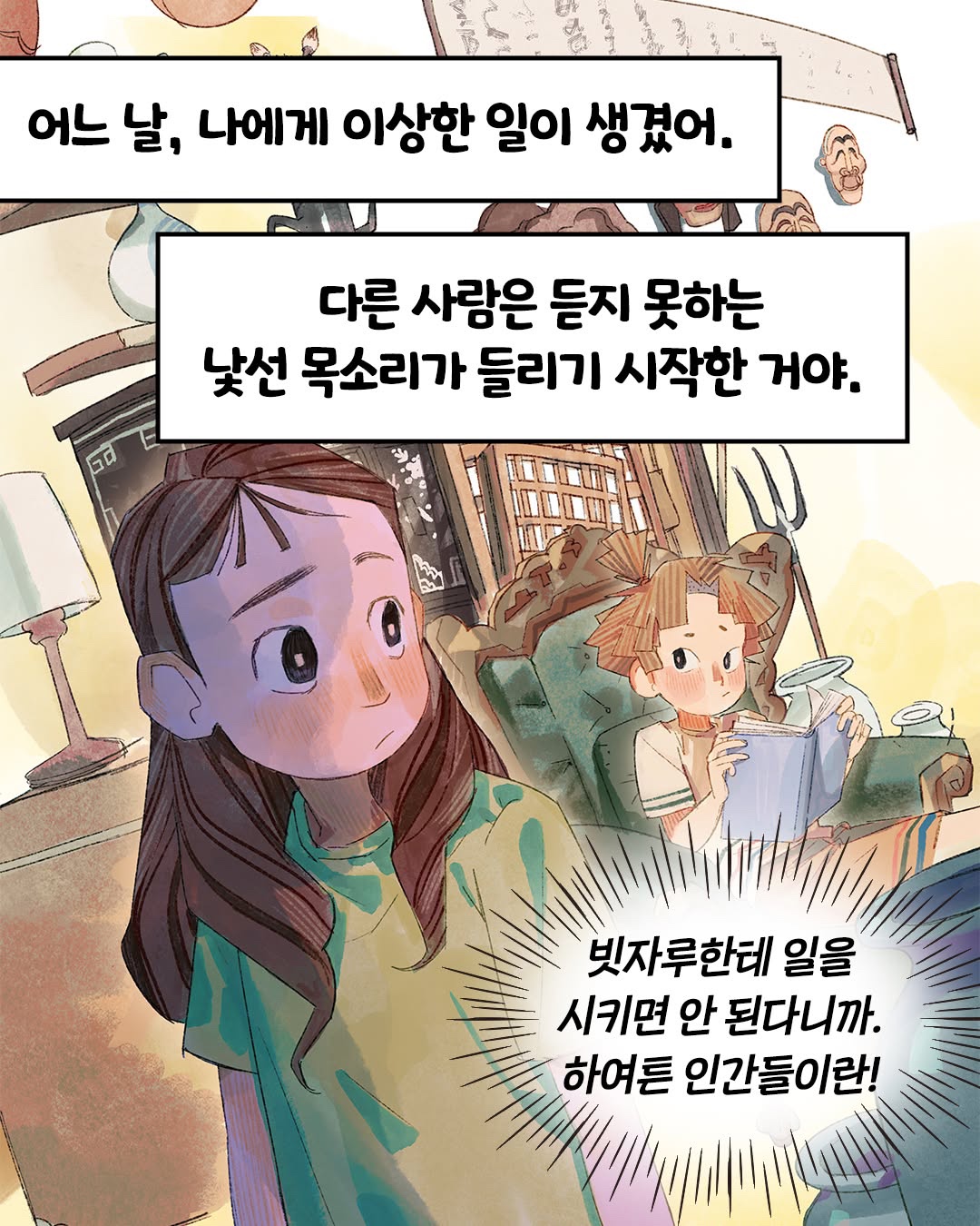 가빈은 언뜻 보기에 평범해 보이는 소녀이다. 평범하지 않은 구석이라고는 가족이 할머니뿐이라 조금 단출하다는 것과, 할머니가 늘 무언가에 쫓기듯 한곳에 오래 머무르려 하지 않아 이사를 자주 다닌다는 것 정도. 그런데 어느 날부터인가, 가빈에게 다른 사람 귀에는 들리지 않는 목소리가 들리기 시작한다. 그리고 목소리의 정체에 가까워질 때쯤 할머니가 사라지고 만다!
