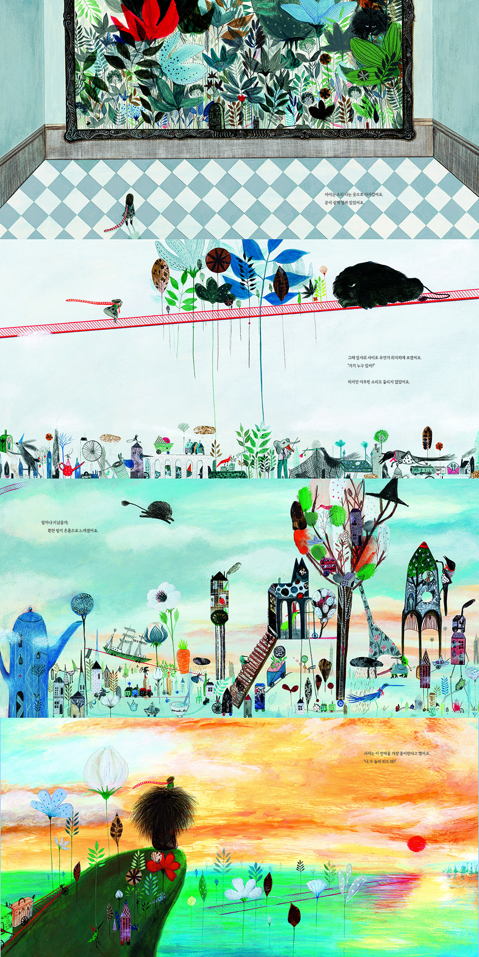 벽에 걸린 액자의 거리를 보폭 삼아 고요히 그림을 감상하는 엄마 아빠 사이에서, 아이는 신비한 소리에 이끌려 커다란 그림 앞에 선다. 마치 아이를 초대하기라도 한 듯 그림 속에서 문이 스르르 열리고, 아이는 길이 이끄는 대로 성큼성큼 나아가는데…….